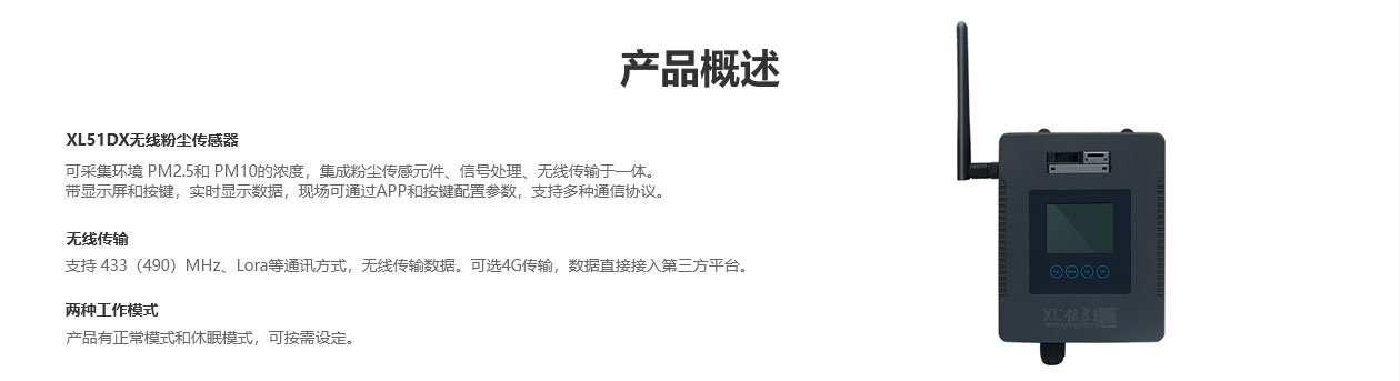 XL51DX無線粉塵傳感器,可采集環境 PM2.5和 PM10的濃度,集成粉塵傳感元件、信號處理、無線傳輸于一體。帶顯示屏和按鍵,實時顯示數據,現場可通過APP和按鍵配置參數,支持多種通信協議。