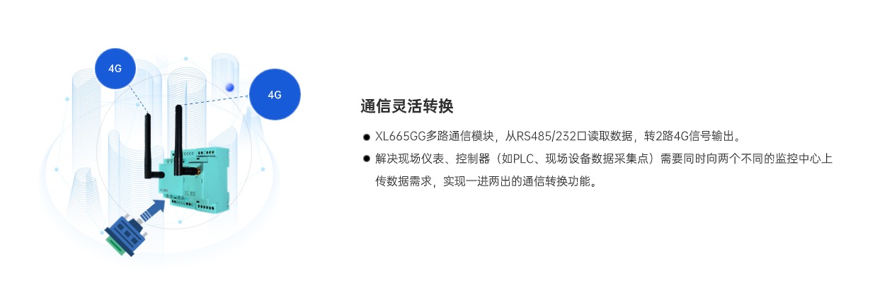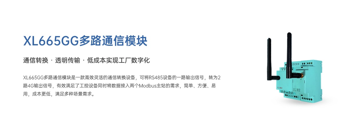 XL665GG多路通信模塊是一款高效靈活的通信轉換設備,可將RS485設備的一路輸出信號,轉為2路4G輸出信號,有效滿足了工控設備同時將數(shù)據(jù)接入兩個Modbus主站的需求,簡單、方便、易用,成本更低,滿足多種場景需求。