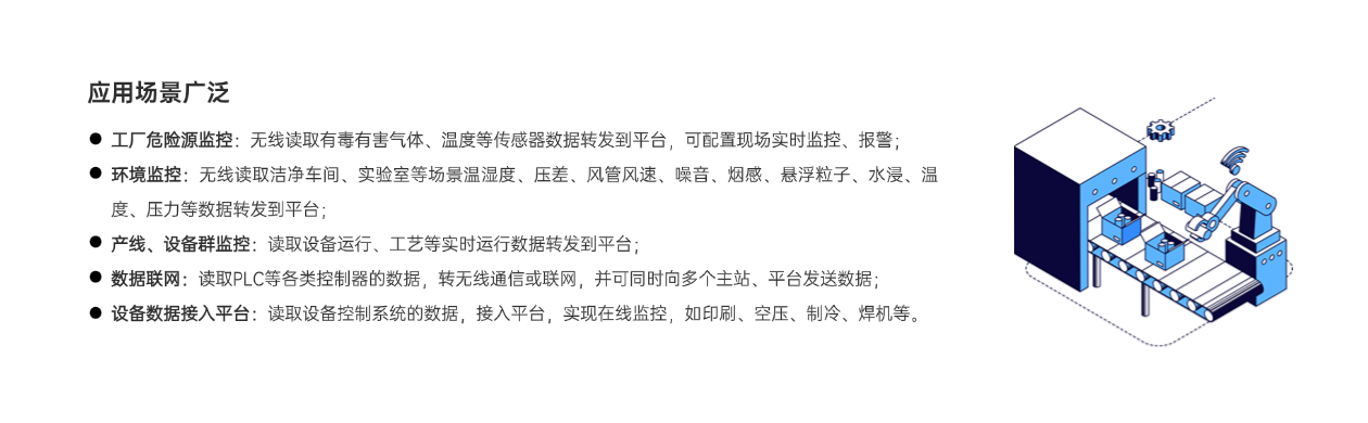 工廠(chǎng)危險(xiǎn)源監(jiān)控,無(wú)線(xiàn)讀取有毒有害氣體、溫度等數(shù)據(jù)轉(zhuǎn)發(fā)到平臺(tái),可配置現(xiàn)場(chǎng)實(shí)時(shí)監(jiān)控、報(bào)警;