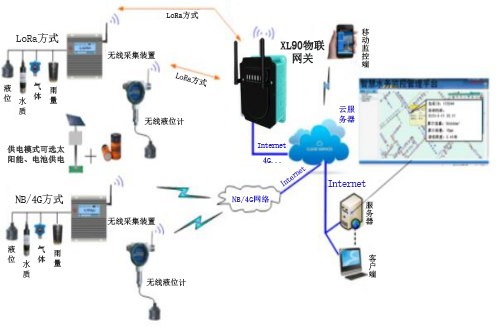 2、傳輸層:傳輸層主要有無線采集裝置、NB、4G、Lora、433MHZ無線傳輸網絡組成。