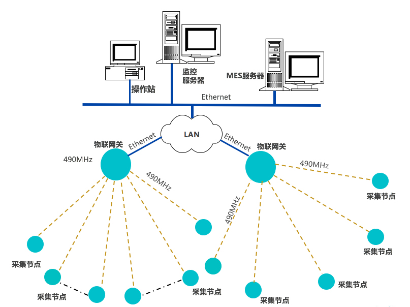 采集節(jié)點(diǎn),通過490MHz無線上傳數(shù)據(jù)至物聯(lián)網(wǎng)關(guān),網(wǎng)關(guān)通過Ethernet,接入LAN,推送數(shù)據(jù)至MES服務(wù)器;