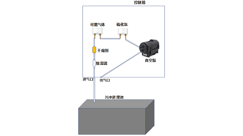過程:用聚四氟乙烯管,聯(lián)接整個(gè)氣體通路。管直接伸入污水池,聯(lián)接控制箱進(jìn)氣口,氣體從進(jìn)氣口,至過濾器、除濕器,至傳感器探頭進(jìn)、出氣口(兩臺(tái)傳感器的進(jìn)、出氣口串聯(lián)),至真空泵抽氣口,從真空泵排氣口聯(lián)接控制箱出氣口;