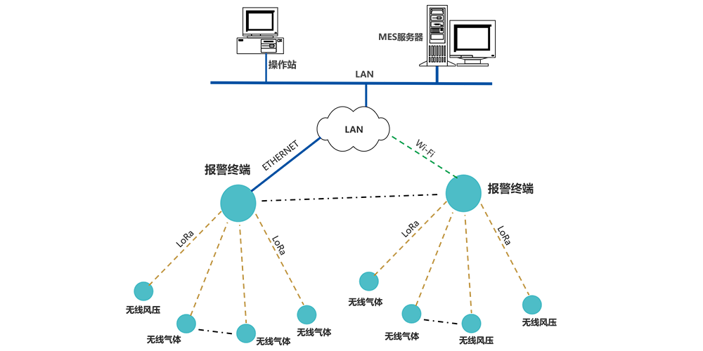 報(bào)警終端無線讀取監(jiān)測點(diǎn)上傳的數(shù)據(jù),進(jìn)行處理、顯示、報(bào)警;并將數(shù)據(jù)通過局域網(wǎng),MQTT協(xié)議,上傳至MES。