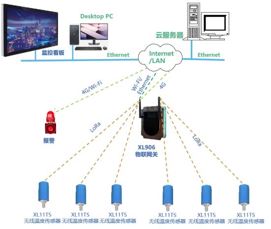 XL11TS無線溫度傳感器等采集節點,通過LoRa無線傳輸技術將溫度數據傳輸至XL906網關;
