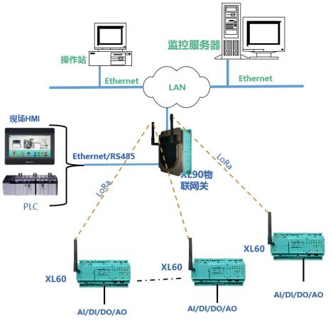 方案一:XL60無(wú)線采集裝置采集的現(xiàn)場(chǎng)設(shè)備數(shù)據(jù),采用LoRa無(wú)線傳輸方式,傳輸至XL90物聯(lián)網(wǎng)關(guān),經(jīng)協(xié)議轉(zhuǎn)換后將數(shù)據(jù)通過(guò)Ethernet或RS485上傳至監(jiān)控平臺(tái)、PLC、觸摸屏、控制器等設(shè)備。