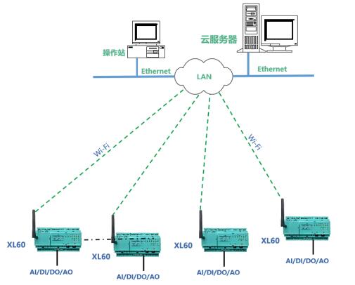 方案二:對(duì)于覆蓋Wi-Fi的區(qū)域,XL60無(wú)線采集裝置可直接通過(guò)Wi-Fi接入局域網(wǎng),通過(guò)LAN直接推送數(shù)據(jù)至監(jiān)控服務(wù)器。