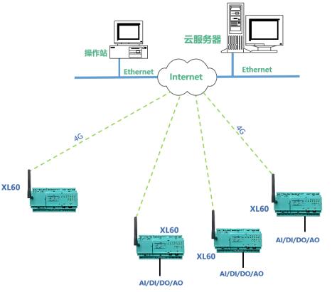 方案三:對(duì)于位置偏遠(yuǎn)或安裝分散的設(shè)備運(yùn)行參數(shù),如管網(wǎng)、管溝的壓力、溫度、液位、流量、氣體濃度等信號(hào),XL60無(wú)線采集裝置可采用4G通信將采集的數(shù)據(jù)直接上傳至云平臺(tái)。