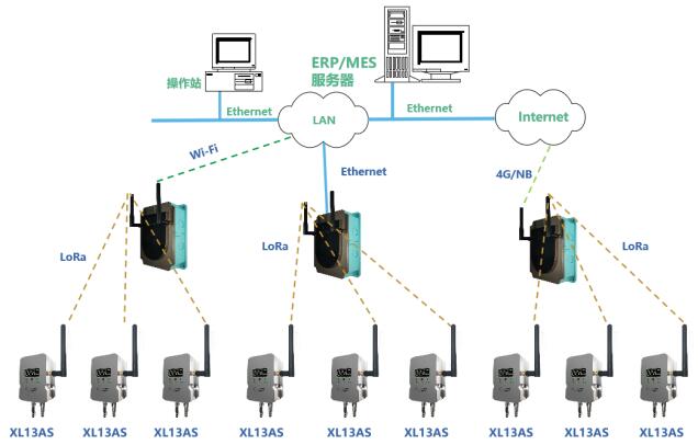 XL13AS 無線風(fēng)管風(fēng)速傳感器通過 LoRa 無線傳輸方式,將數(shù)據(jù)上傳至 XL906 物聯(lián)網(wǎng)關(guān) ,網(wǎng)關(guān)可選以太網(wǎng)、 Wi-Fi 、 4G 通信方式,推送數(shù)據(jù)至監(jiān)管平臺(tái)、企業(yè)生產(chǎn)管控服務(wù)器等。