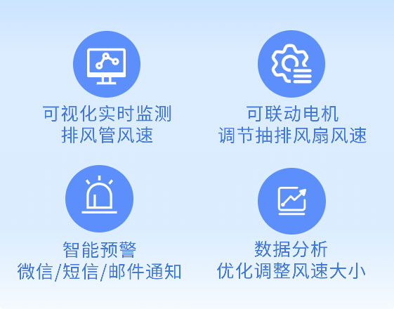 根據(jù)現(xiàn)場(chǎng)需求,可聯(lián)動(dòng)電機(jī),當(dāng)風(fēng)速過小或者過大,自動(dòng)調(diào)節(jié)抽排風(fēng)扇的轉(zhuǎn)速,以保持排氣管道內(nèi)的風(fēng)速控制在合適范圍內(nèi)。