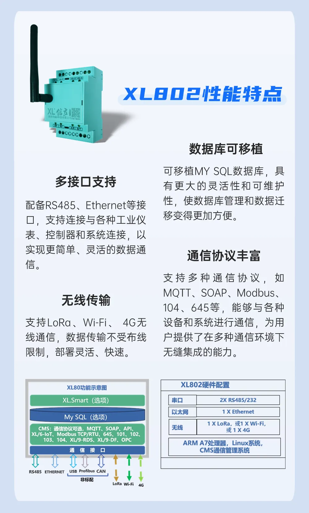XL802通信主機對采集的數據進行處理、協議轉換,通過EthernetWi-Fi4G通信方式,將數據傳輸至監控平臺。