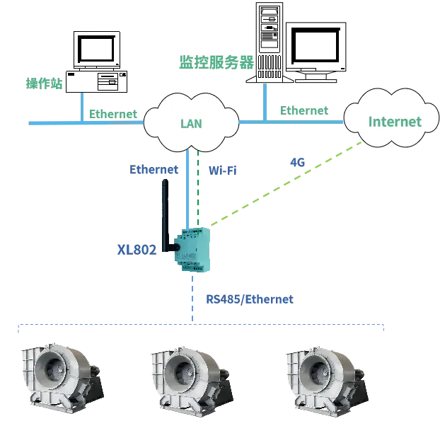 選擇XL802通信主機,接入離心風機的PLC,實時采集設備風量、風壓、轉速、功率等運行參數。