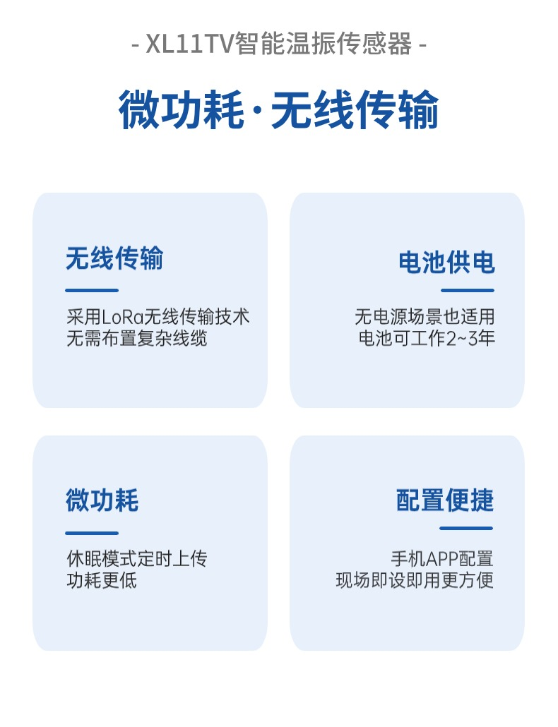 XL11TV溫振傳感器通過振動 + 溫度雙參數監測,可實時捕捉設備異常信號,結合監控平臺智能算法實現智能故障預警,為企業構建 預防為主的設備管理體系提供技術支撐。