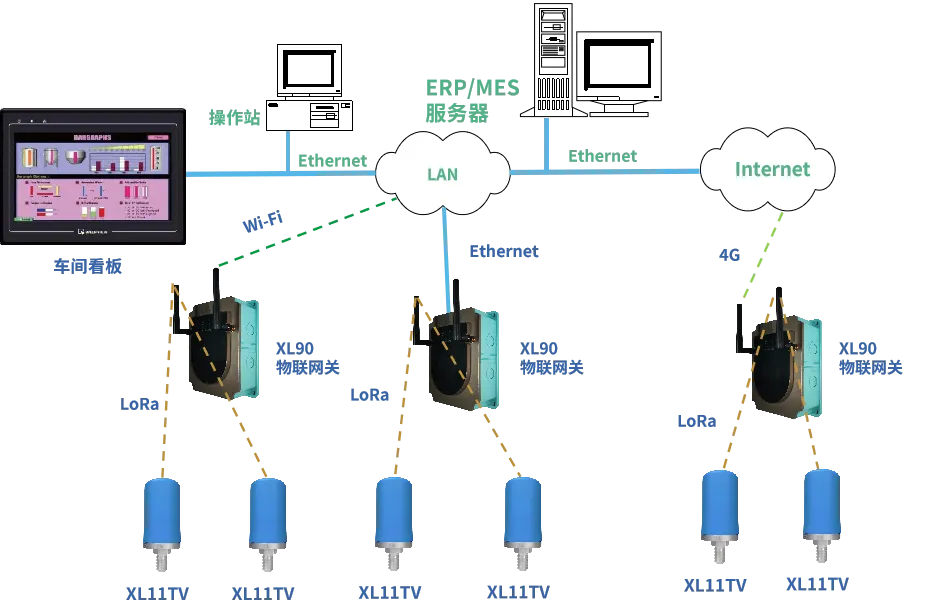 監測系統采用無線傳輸設計,XL11TV溫振傳感器采用LoRa 無線傳輸數據給XL90網關,網關對數據進行協議轉換后,通過Ethernet/WiFi/4G傳輸數據至監控平臺。